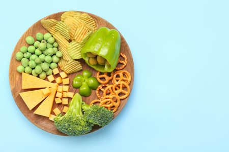 Wooden board with different products for St. Patrick's Day celebration on blue background