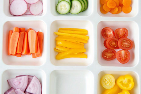 Assorted fresh colorful vegetables neatly arranged in a white tray.