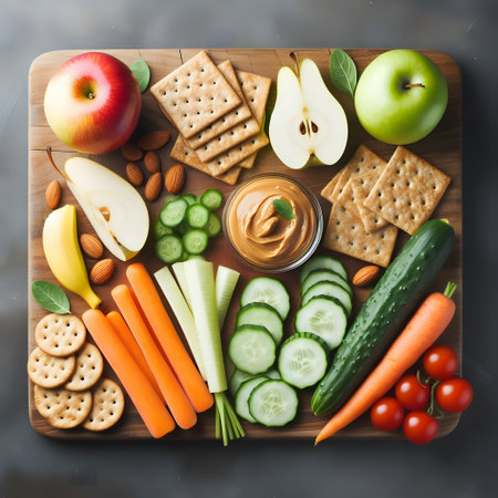 A vibrant display of fresh and healthy snacks featuring colorful carrots, nuts, and seasonal vegetables, perfect for gatherings and nutritional balance.