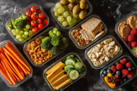 Healthy food in plastic containers on black background Clean eating concept Healthy eating concept Assortment of healthy food in plastic containers AI generated