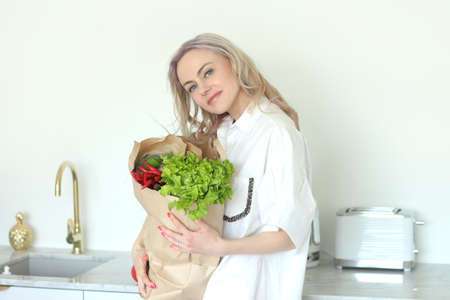 cheerful woman in a white t-shirt package with groceries from the supermarket health