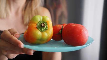 Tomato and pepper on a blue plate on a light background on the kitchen. Woman holding plate with fresh vegetables.