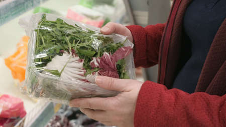 Pregnant women buys a salad of arugula and radicchio in the store. Close up shot. The concept of shopping, vegetarianism, consumption of vegetables and vitamins