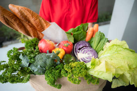 Delivery company worker holding grocery bag, food order, supermarket service, accepting groceries box from delivery woman at home, Fresh organic vegetable delivery