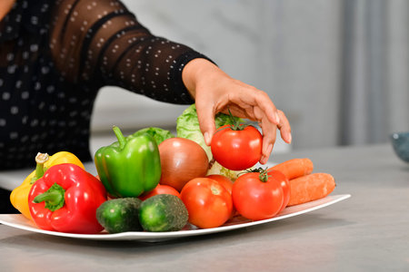 Close up of a female hand picking up a delicious looking tomato from a plate with assorted vegetables. Healthy food and vegetables concept.