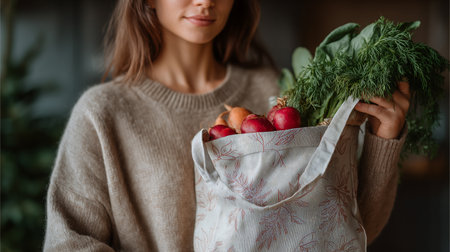 Unpacking a bag of fresh vegetables and greens after grocery shopping. Healthy eating concept.