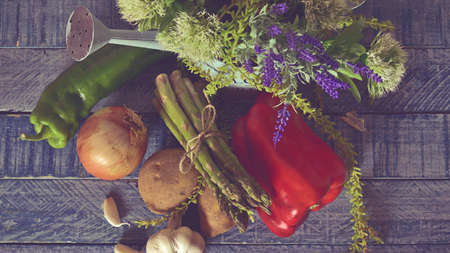 Fresh colorful organic vegetables on a rustic wooden table background.