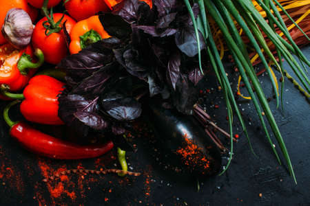 food organic parsley basil vegetable tomato garlic pepper eggplant pasta concept