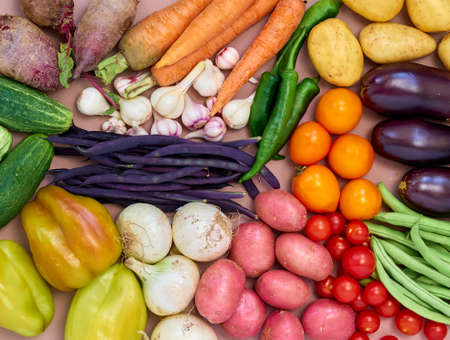 Top view flat lay Organic vegetables composition. Vegetables variety on color paper background. Healthy food concept. Vegan and vegetarian eating. Foods high in vitamin, antioxidant, mineral and fiber