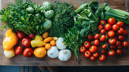 A beautiful arrangement of fresh organic vegetables and herbs on a wooden table, showcasing a basket of greens and vibrant tomatoes, perfect for culinary inspiration and healthy cooking.