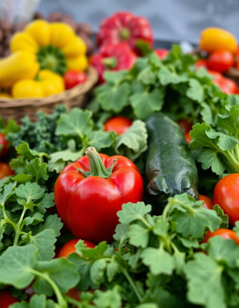 Vibrant assortment of fresh vegetables including peppers, carrots, and kale.