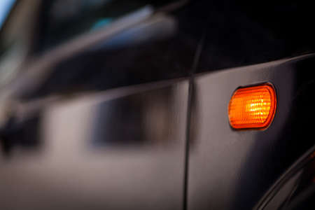 Color close up image of a car's turn signal blinking on the side.