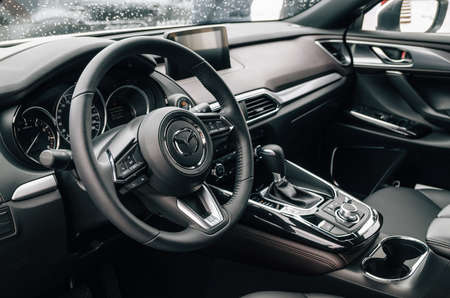 Minsk, Belarus - March 30, 2018: Luxury black interior of Mazda CX-9