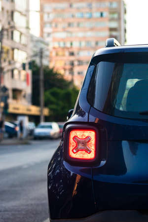 Car rear stop light in sunset, selective focus image of vehicle back light blinking in dark