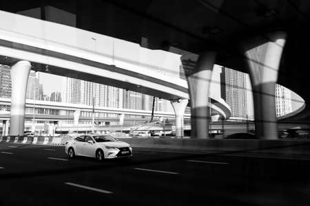 Dubai, UAE February 20, 2018: Lexus rides on the highway against the backdrop of road junctions and overpasses. black and white photo