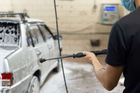 Man holds high pressure water gun, car wash