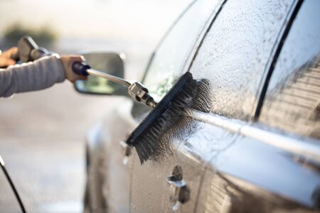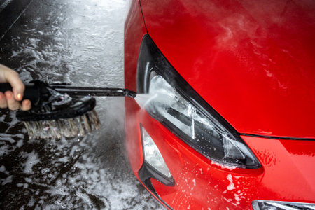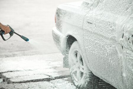 Process of removing dirt from car exterior surface with high pressure washer at self-serve cleaning station outdoors, rinsing off chemicals and white soap suds from vehicle at carwash center