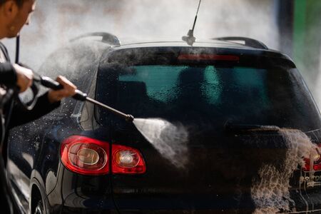 Hands of a male washing black car outdoors in a carwash station, using water jet with soap and high pressured water stream