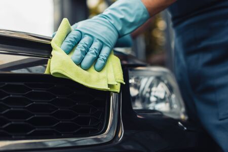cropped view of car cleaner wiping radiator grille with rag