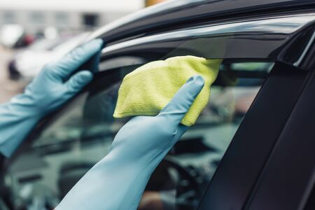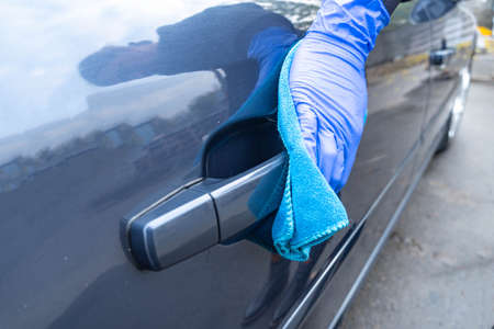 Hand of man in blue protective glove is wiping with a cloth an exterior handle of car door. Coronavirus or Covid-19 protection.
