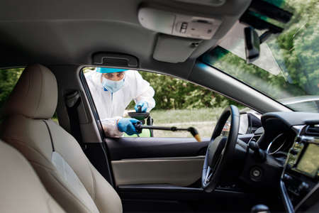 Cleansing car interior and spraying with disinfection liquid.