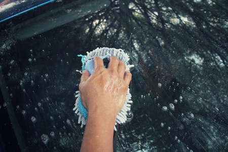 Male spreading cleaning detergent on car window with brush
