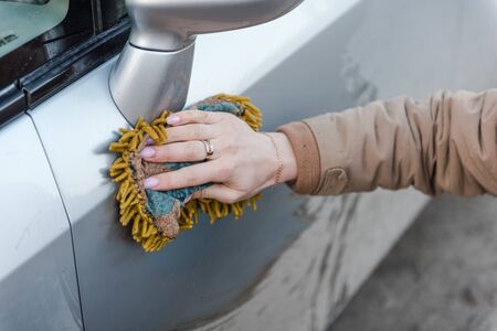 Young woman cleaning side mirror of her car, closeup detail on hand with red fingernails in glove holding yellow sponge