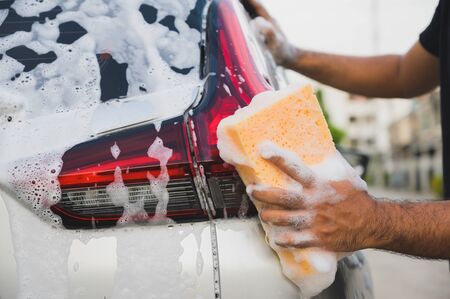 Man cleaning washing car with sponge and foam