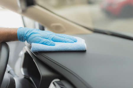 Professional cleaner and car cleaning concept. Unrecognizable man cleans car interior with cloth. Selective focus. Washing auto dashboard with rag