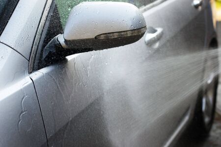 Water and foam under pressure flies toward the car body. Close-up view