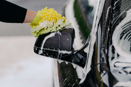 Mans hand holding sponge for washing car. Black auto with soap bubbles. Cleaning concept. Worker cleaning automobile