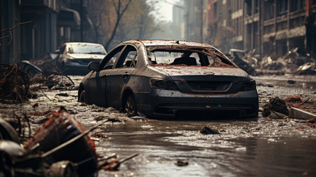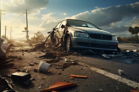 Wrecked car damaged vehicle broken glass debris urban street destruction aftermath disaster dramatic sunlight
