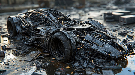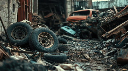 A gritty junkyard scene showcases abandoned vehicles and discarded tires, capturing the essence of urban decay and environmental neglect in a chaotic landscape.