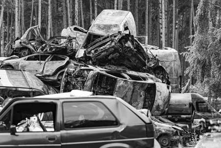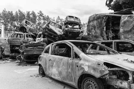 Irpin, Kyiv region, Ukraine - 28 April 2022: Car graveyard in Irpin, consequences of the invasion of the Russian army in Ukraine. Destroyed cars of civilian population.