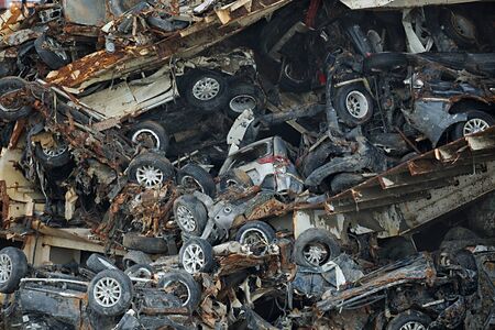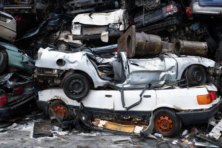 Damaged cars on the junkyard waiting for recycling or destruction