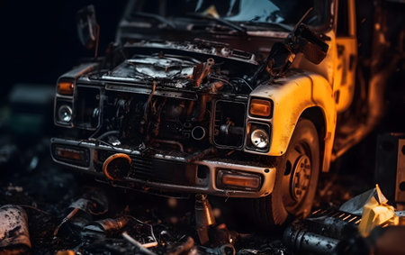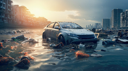 Crashed abandoned rusty expensive atmospheric suv as circulation banned for co2 emission 2030 agenda dystopian concept ai generated