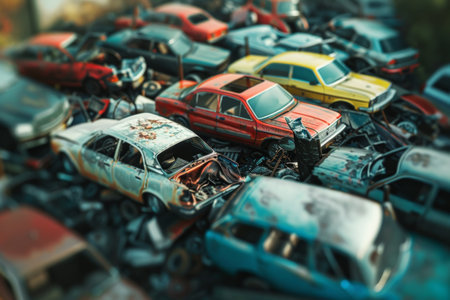 aerial view of stacked aged vehicles in junkyard, created with generative ai