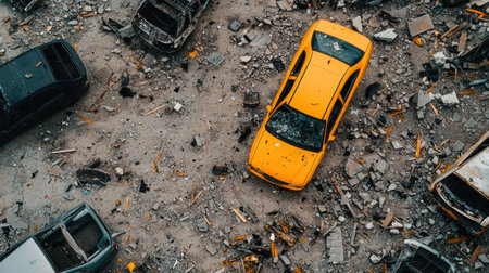Abandoned Yellow Car Surrounded by Wreckage and Debris in a Desolate Junkyard Landscape, Aerial View Revealing Urban Decay and Ruins