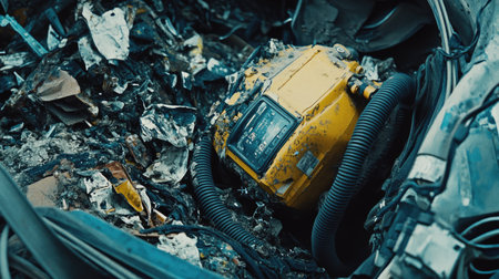 This image presents an abandoned yellow industrial equipment hidden amidst a clutter of debris and waste, reflecting themes of neglect and environmental degradation.