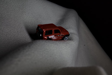 A selective focus shot of a red toy car on a black surface