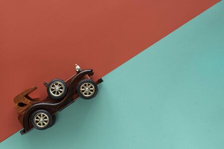 Retro vintage car on multicolored paper background. Vacation, delivery, travel concept. Top view, flat lay. Red mint stipes.