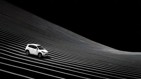 A white crossover car is positioned on a striped, abstract, and undulating surface against a dark...