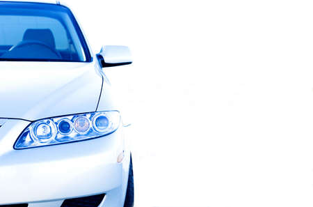 Bumper, Front of the white sports car.The car is on the road.Element for design.The headlight of the new clean white sports car has an aggressive shape with a piece of bonnet and black wheel, a bumper. black and white image