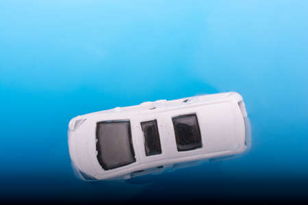 Model of a toy brown car on the hood of a white car. Horizontal photo.