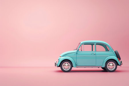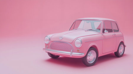 Pink vintage car parked on pink background with a heart symbol on its front grill, representing love and valentine's day