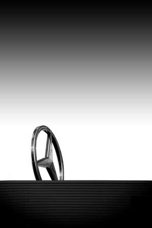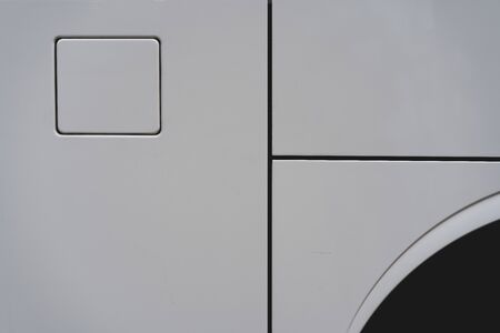 Square hatch with lines and scratches in the board of a white bus with black tires