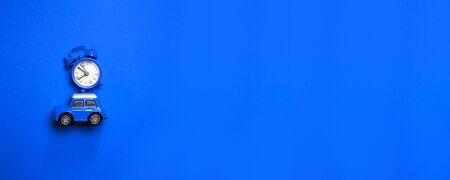 Christmas time composition of little blue childrens car model with alarm clock on the hood on a blue minimal background with copyspace