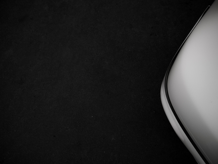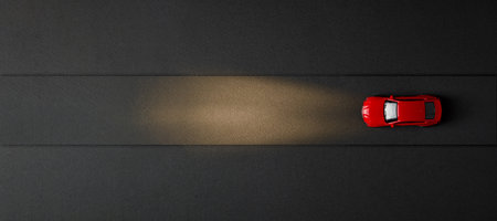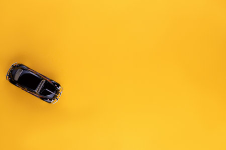 A black car figurine shot from above, on yellow background, aligned at the bottom left.