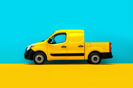 Bright yellow van on vibrant red backdrop near bold black and yellow crosswalk lines creating a striking urban visual contrast