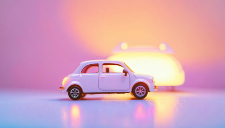 Toy car model floating in the air, isolated in blue-red neon gradient light. levitating objects. Minimal concept